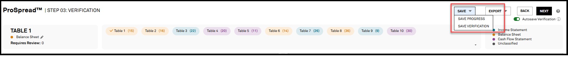 Users can now leverage the "Save Progress" feature to effortlessly save their work up to a point in time and resume their work at their convenience, all while maintaining confidentiality of their data. Users can save their workflow at any point after starting the verification of extracted data, giving them a local copy of their saved progress. They can then easily upload this saved file to continue their work seamlessly.