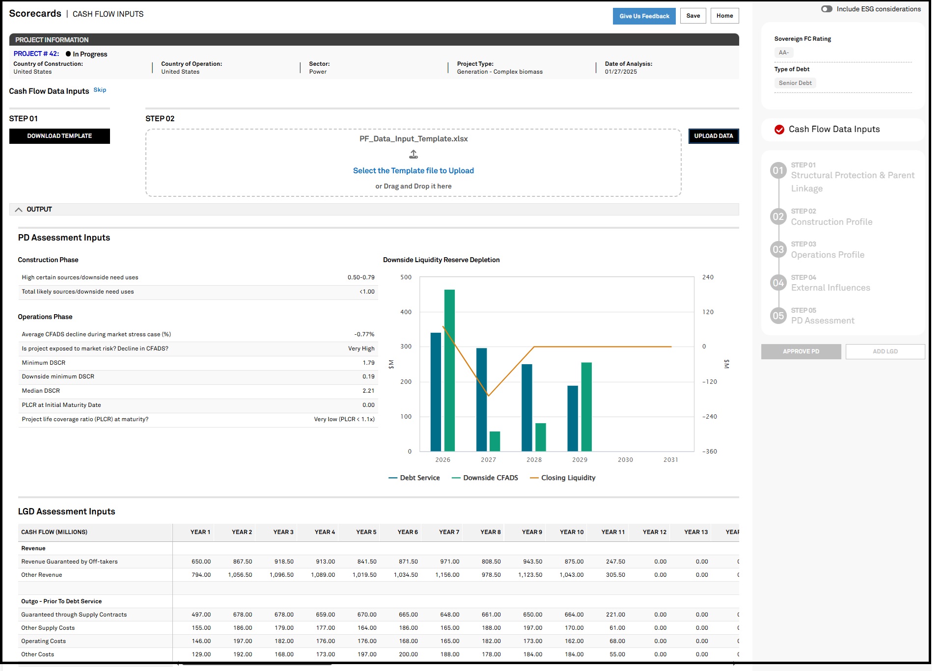 We introduced a Cash Flow data input template in the Project Finance app to streamline inputs for Probability of Default (PD) and Loss Given Default (LGD) assessments.